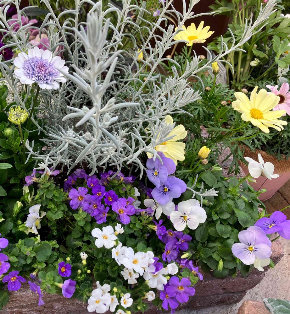 淡い色の反対色を使った寄せ植えですね💜🍋🌿✨