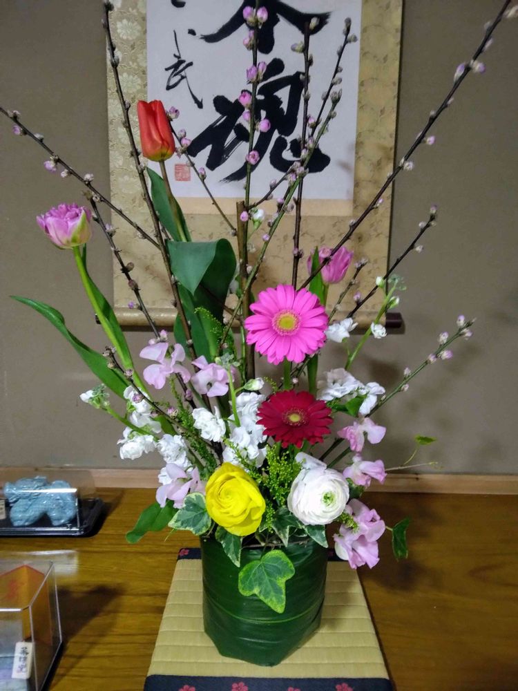 テキストのお手本は菜の花がしようされてましたが、代わりに白の八重咲きストックが入ってました。