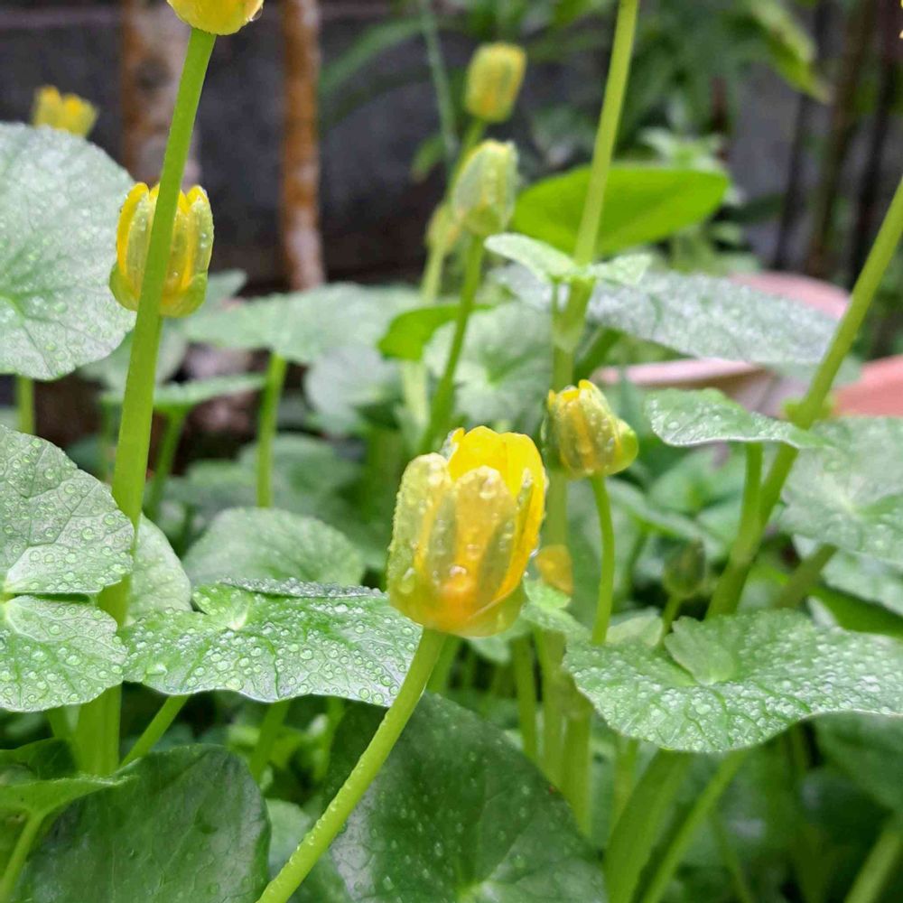 2️⃣開こうか迷ってるようなヒメリュウキンカは、表の花弁は鮮やか黄色、裏は葉っぱ🌱と同じツヤツヤの緑、見事に変面します