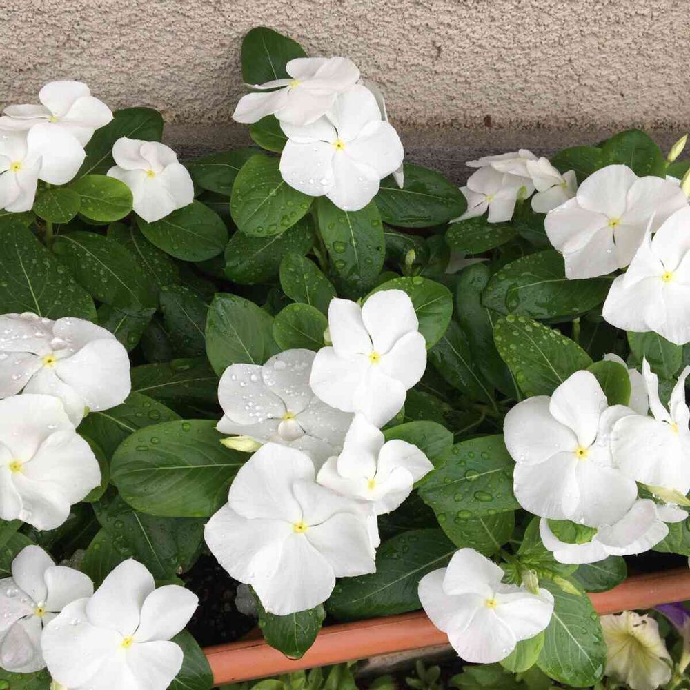 雨でも頑張ってるニチニチソウ。白さが際立ちます✨