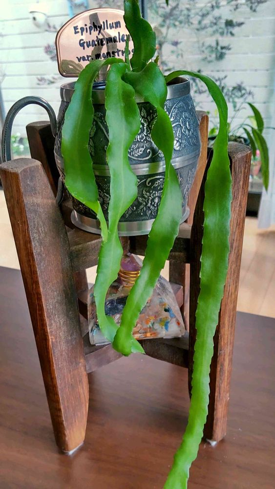 新しくお迎えした植物😃錫製のコップを鉢カバーにしたエピフィルムグアテマラこれからウネウネとした姿になるのかしらね。銅製のネームプレートに名前を記してみた。なんか特別感がでた🤣