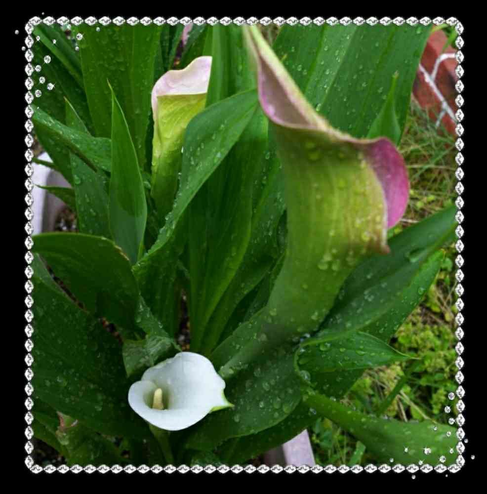 ちょうど雨が止んでいましたので、「なにか雨粒がいい感じになっているお花はないかしら?」と見渡したところ、まだ投稿していなかったカラーを見つけましたのでチャンスを逃さず・笑