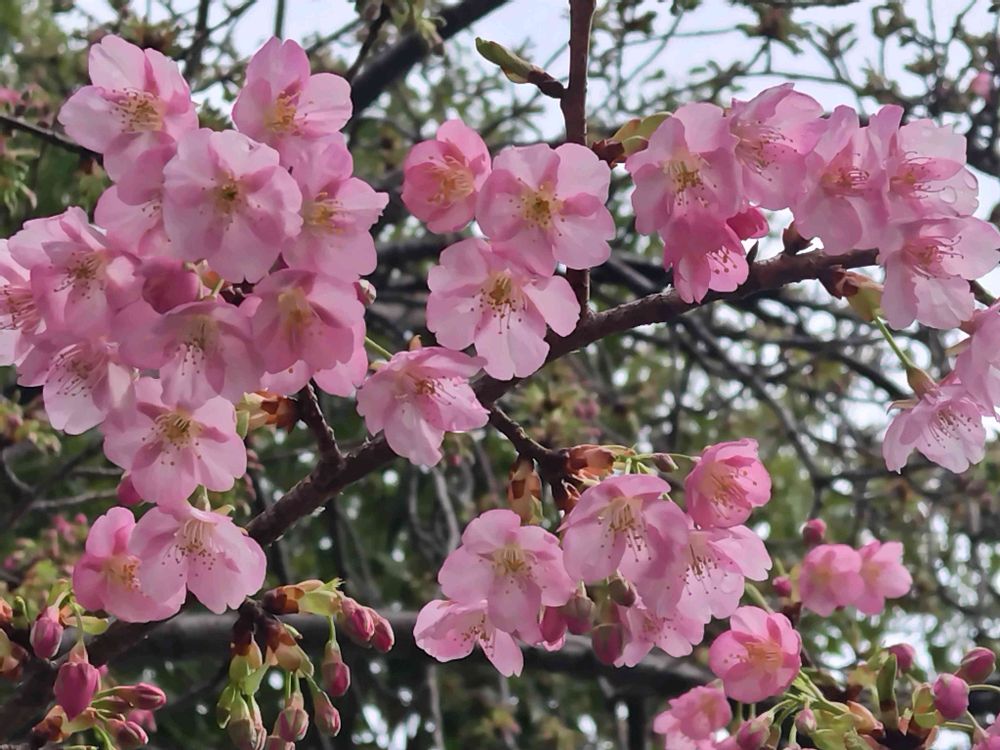 桜はGoogleさんは河津桜と教えてくれました。まだ木の下半分くらいですが、この時期に開花は例年より早いと思います🌸観光客が集まっていました〜