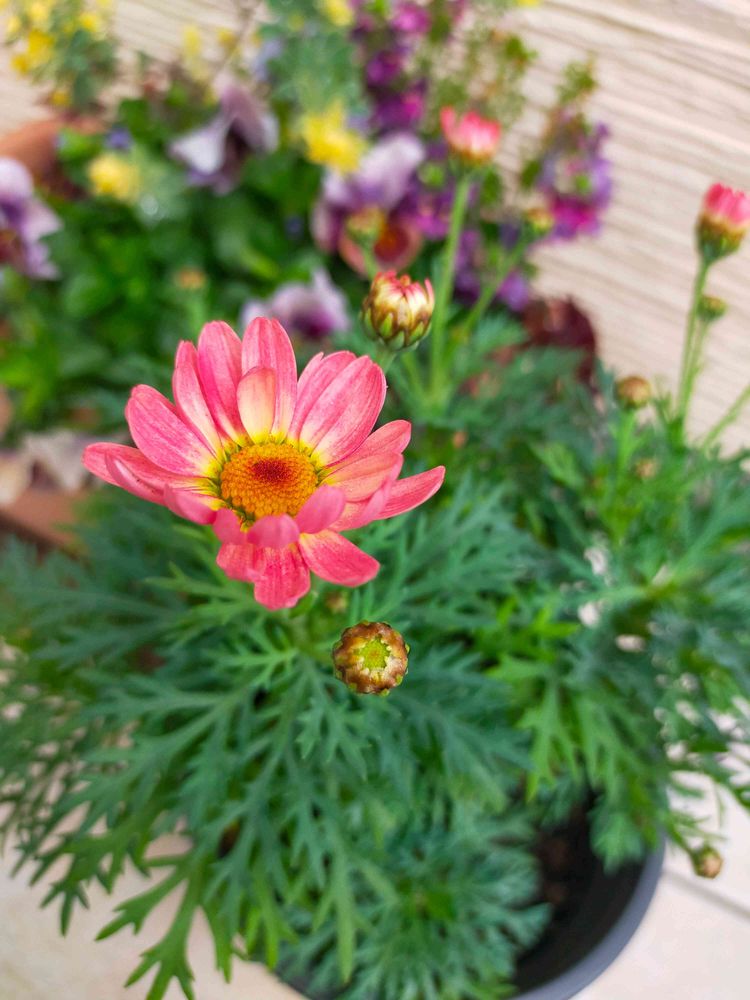 先日の暖かさで蕾が色付き、明日は雪予報が出ているというのに、開花してしまいました🌼挿し木のマーガレット、シンプリーコーラル💖玄関に避難です💨