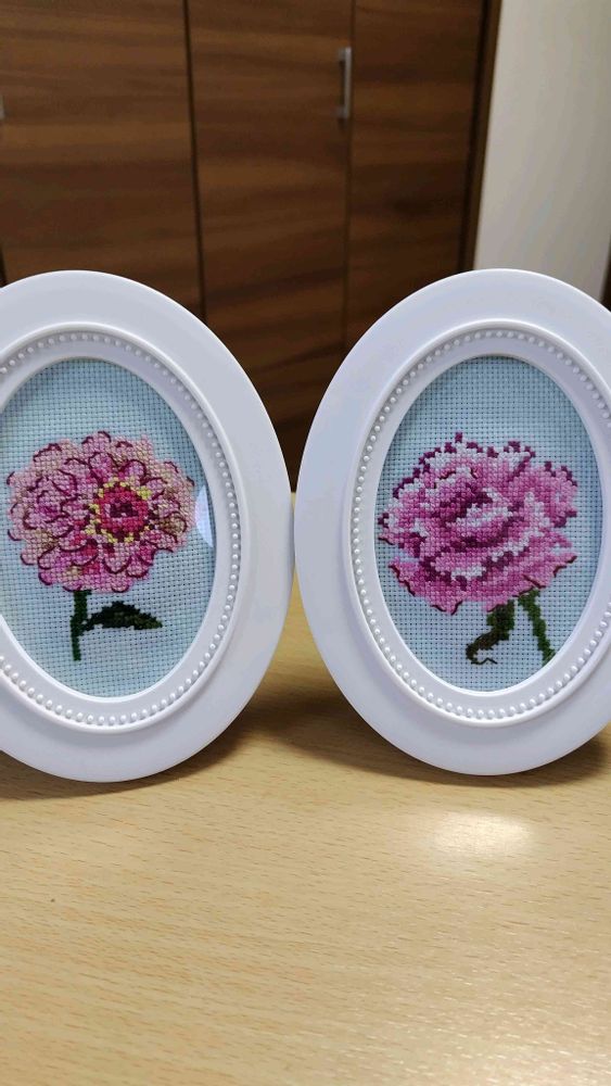 花びらがいっぱい詰まった百日草とカーネーションの刺繍🪡額縁のパールにも似合って素敵ですねー