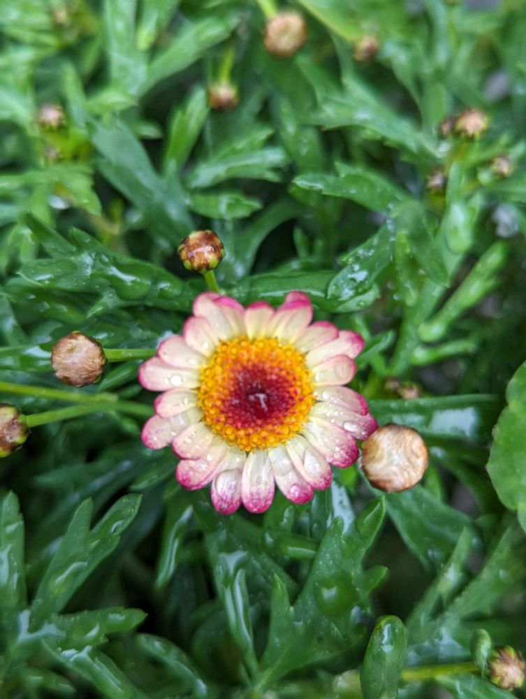 ボンザマーガレットが雨に濡れて咲いてる姿、可愛い💕