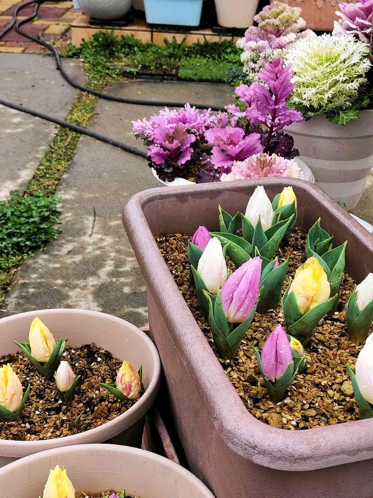 地際で蕾が出てしまってまだ咲かないで~!と日陰でガンガン水やりしながら育てていたチューリップ、ほぼ全員蕾が出てしまったので表に出しました。今年は暖かいのでチューリップはもうほぼ全員地面からこんにちはしてしまってます…葉牡丹とまとめて色をリンクさせてパステル系のコーナーにしてみました。