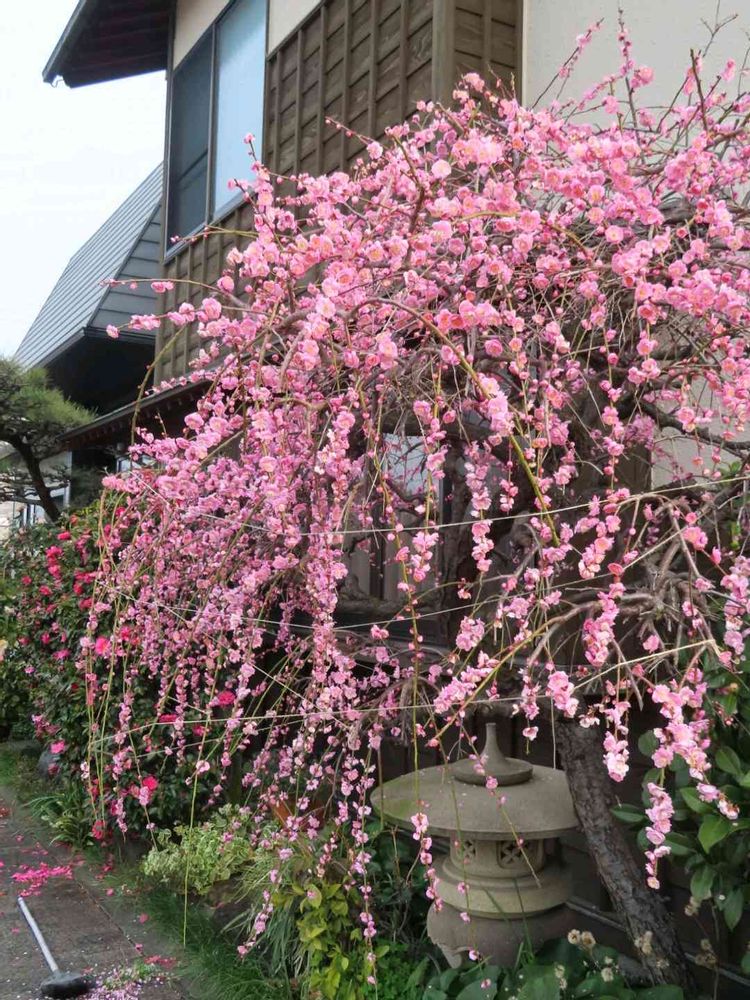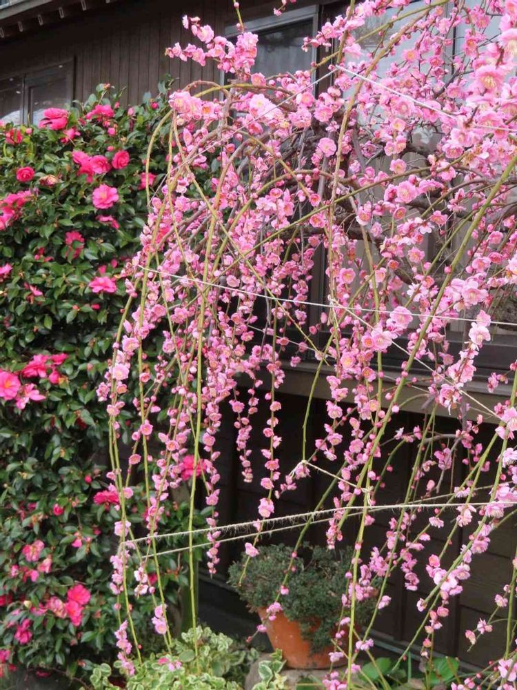 綺麗に咲いた枝垂れ紅梅(①~③)、山茶花(②)、椿(④、⑤)が和風家屋とマッチして、おしゃれな雰囲気が素敵でした。