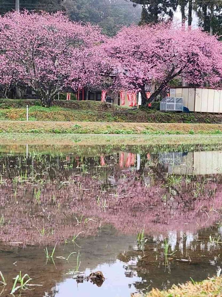 田んぼが水鏡になって写る河津桜は素敵ですね。🌸