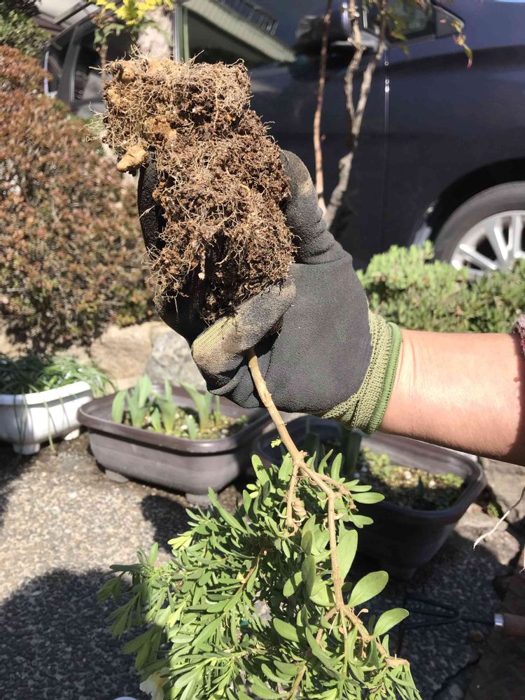 とても根強く、冬場も枯れずにいたカリブラコア スーパーベルダブルミルクレープを垣根の根元に植え替えました。