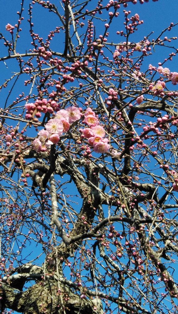 家の庭の✨枝垂れ梅✨です!やっと咲き始めました~!下から見上げるように撮りました~青い空に映えますね~🎶