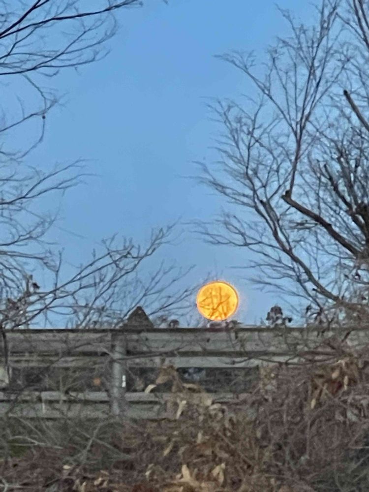 ➊ 6:05分頃、職場の北側を走る圏央道のガードレールに今まさに沈み行くお月さまに出逢ったので思わずパチリ!です。