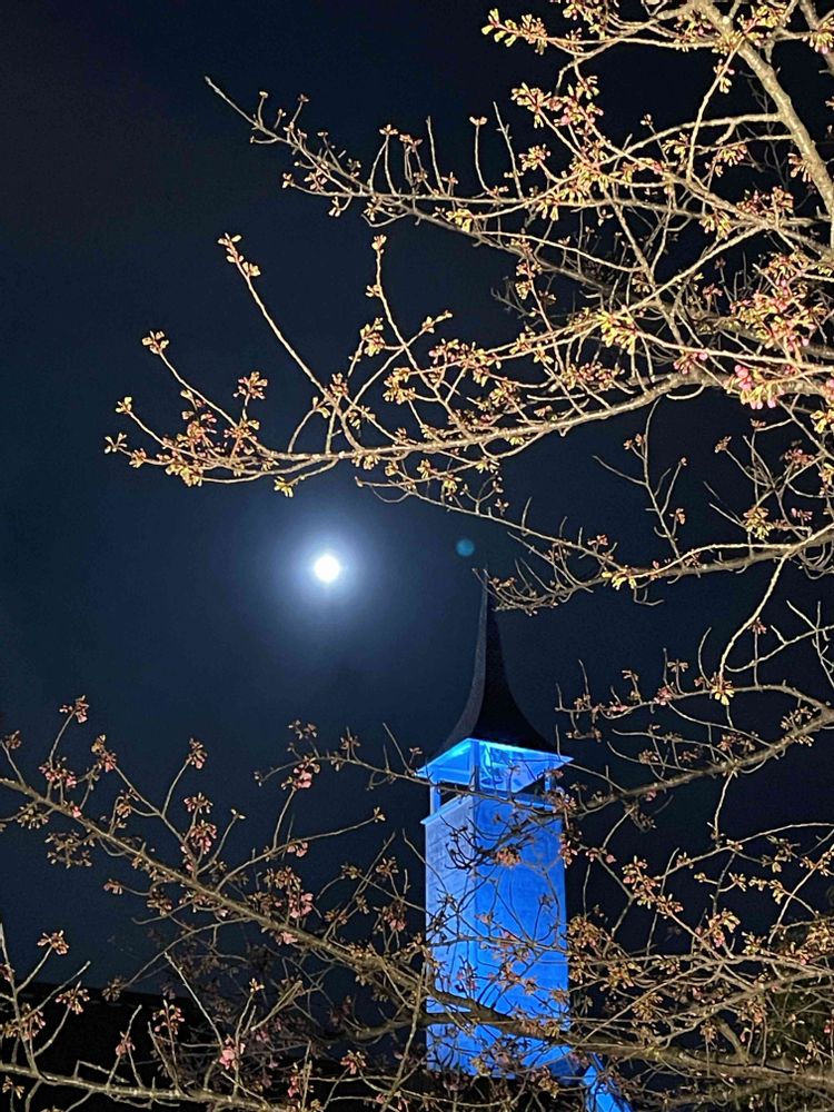 お月様と開花を待つ河津桜さん、アングルが良いですね〜😃💓✨