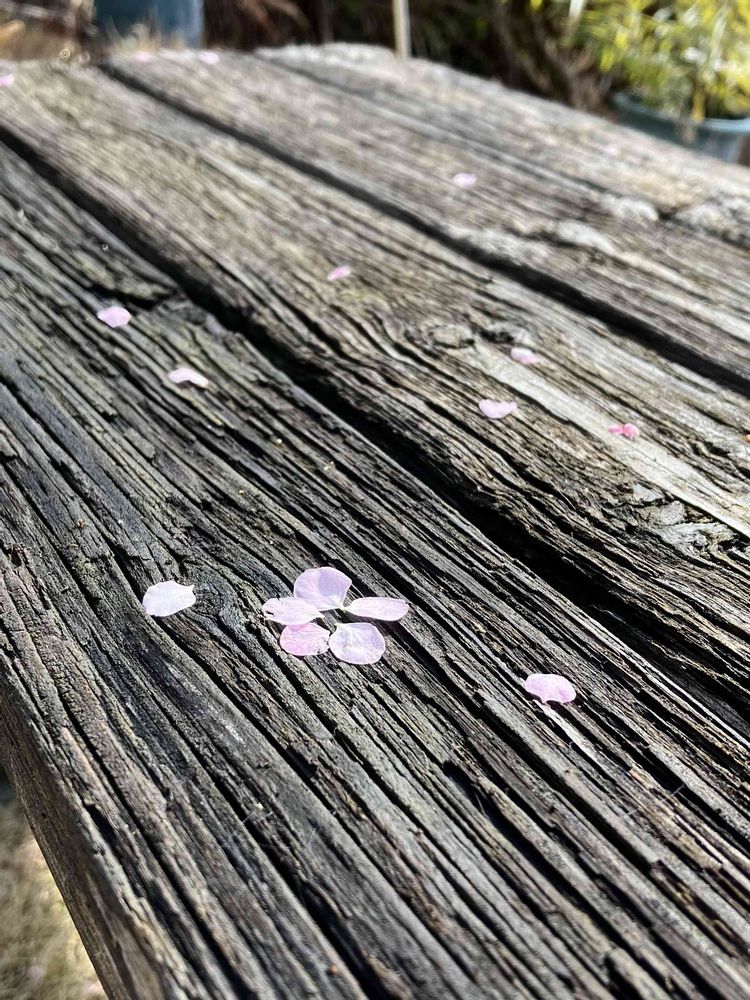 庭のベンチに枝垂れ梅の花びらがちらほら
