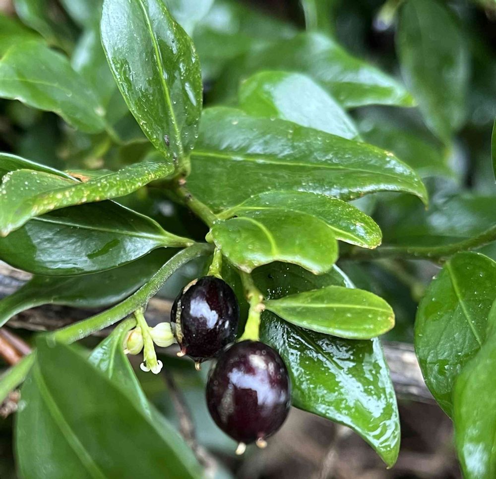 家の近くで一昨年見つけたサルココッカですが、なんでこんな所に?と思いましたが杉の木の根本に生えていてそこはヒヨドリの寝ぐらになってますから、きっとヒヨドリの落とし物から育ったかな?と思います。 元々はヒマラヤに自生していたという植物ですが公園などに植樹されるようになったそうです。