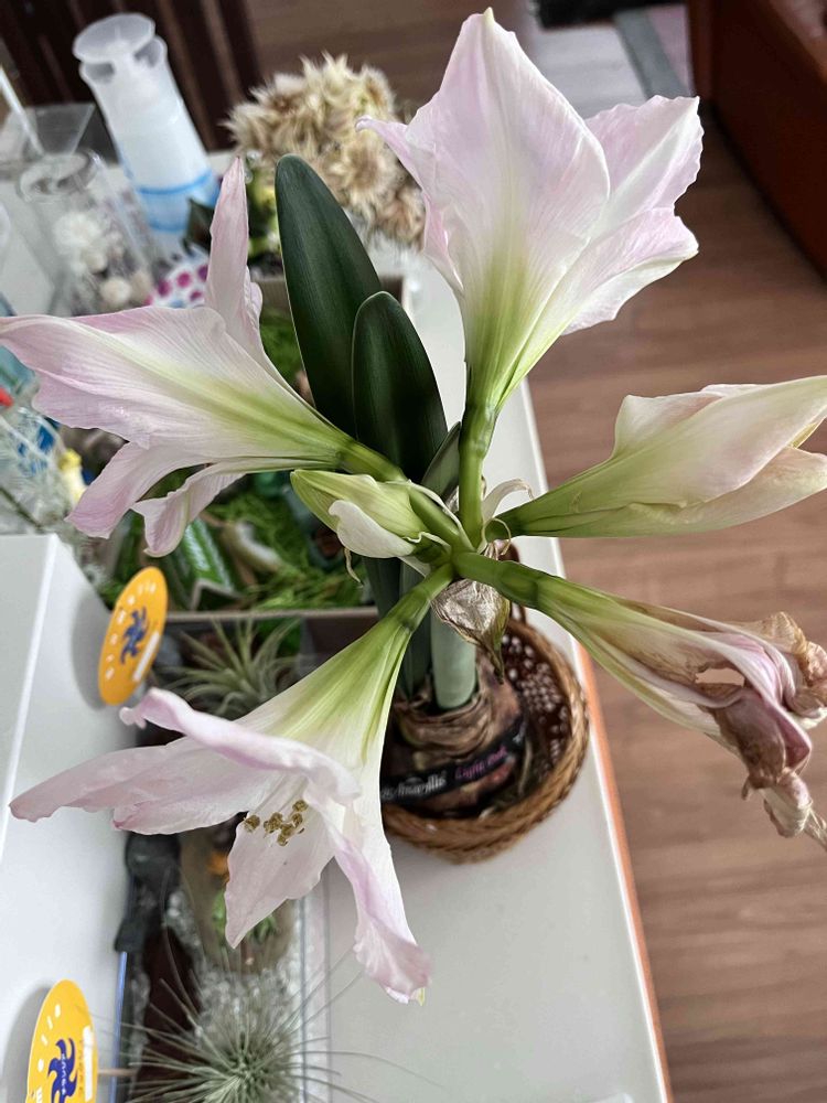 マジックアマリリスって、ちゃんと四方に花が咲き、次の花は前の花が終わるのを待っているよう🤭🩷💚