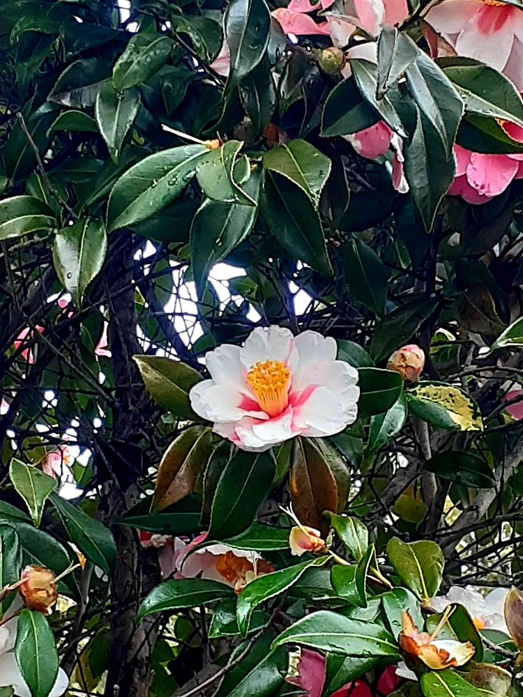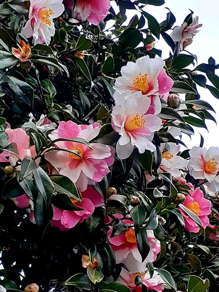 1本の木に、色んな色合いのツバキ🌼