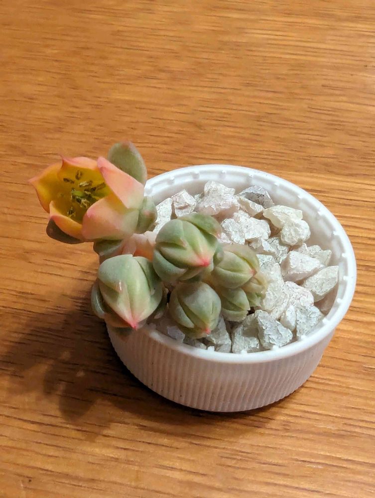 エケベリア ローラの花 花を咲かせると株が弱るので花を楽しみたいなら花めを切りさしておくと良いとの情報を見て、1週間前にキャップにさせておいた所、気がつくと咲いてました😊嬉しいです🍀