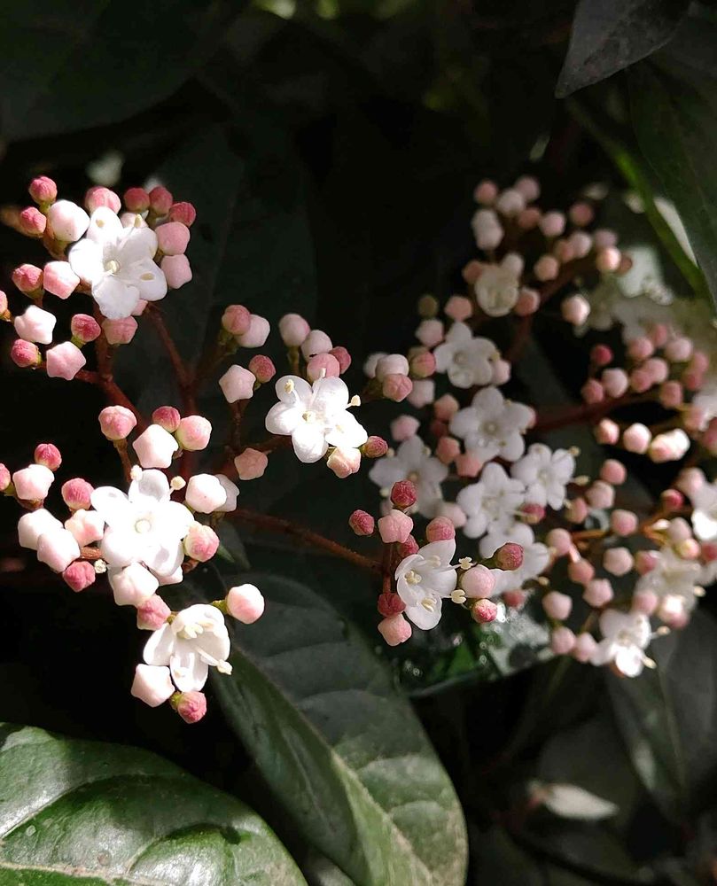 ビバーナムが開花しました。ピンク色の蕾と白色の集合花を数多く咲かせ、花姿はあじさいのようで甘い香りが特徴です。 うちのビバーナムは ビバーナムティヌスです。樹高は2~3m程度になるらしいので鉢植えにしてます。常緑低木なので葉は1年中緑色で表面には艶があります。 8~11月頃には、ブルーベリーに似た濃い紫色の小さな実を付けます。ビバーナムティヌスの実には光沢がある青い実をつけます。 ビバーナムは赤色の実を付ける品種が多いらしいです。