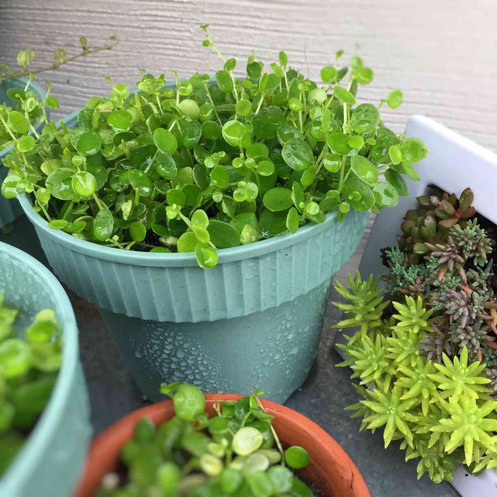 ペペロミア ジェミニ、今回の植え替えはお気に召したよう。春からすくすく育って、数日間降り続く雨にも負けてません。