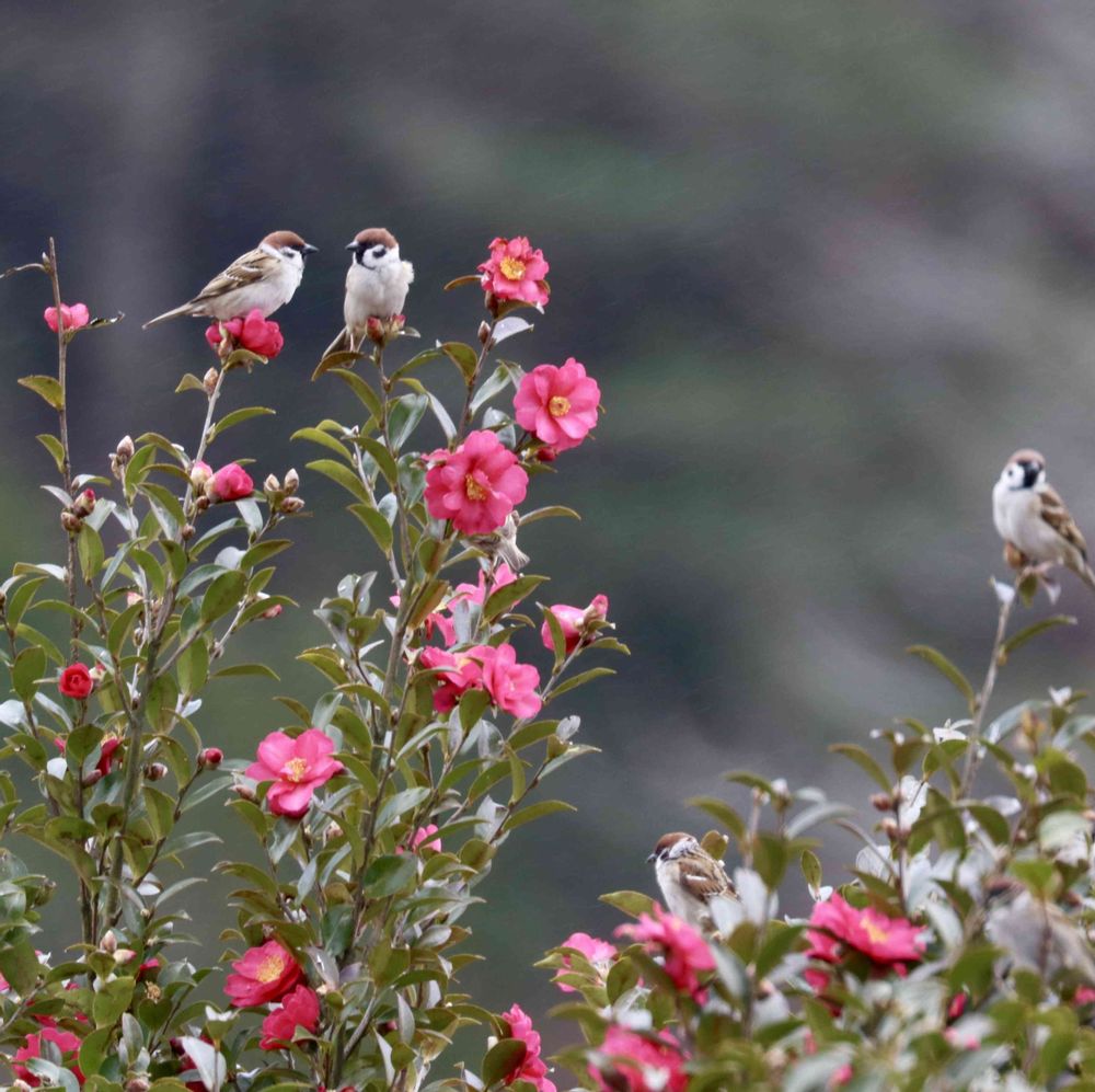 スズメちゃんたち、花の蜜を吸えるのかしら?可愛いですね😍💕