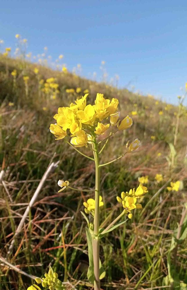 アブラナ科アブラナ属の1~越年草。明治時代初期にヨーロッパから入り、菜種油をとるために栽培され野生化した帰化植物。花期は2~5月。春になると畑や空き地、河原や土手などに群生し『菜の花』として春の訪れを知らせる。野生のカブとキャベツの自然交雑種で、立派なものではカブやダイコンを思わせるサイズにまで根が太くなるが、かたくて食べられない。茎や葉には白粉をまぶしたような特徴がある。蕾は『菜花(なばな)』と呼ばれ、食卓にも春を運ぶ。花は鮮やかな黄色で花弁は十字形に並ぶ。萼片は開かないで目立つ。果実は長角果で長さ5~10㎝、先は細いくちばし状になる。種子は暗褐色、ほぼ球形で果実の中に1列に並ぶ。