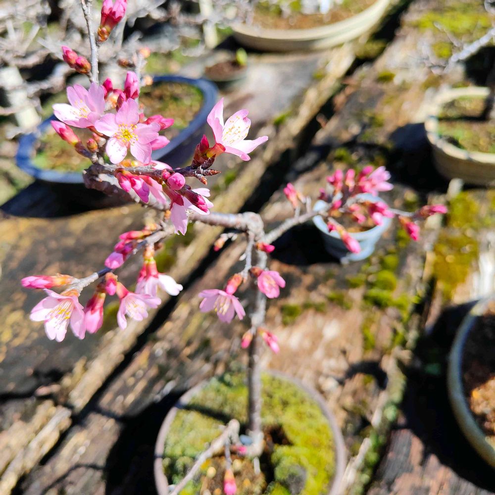 友人宅で咲き始めた〜確か実が二つサクランボの絵の様な形に付くが小さくて渋く食べるには何ともだが可愛らしい富士桜かマメザクラの様に葉は小さく花色が濃いので鉢植えには良いようです 今日はモミジのデショウジョウの枝を挿し木用に持ち帰り〜少し早いが挑戦