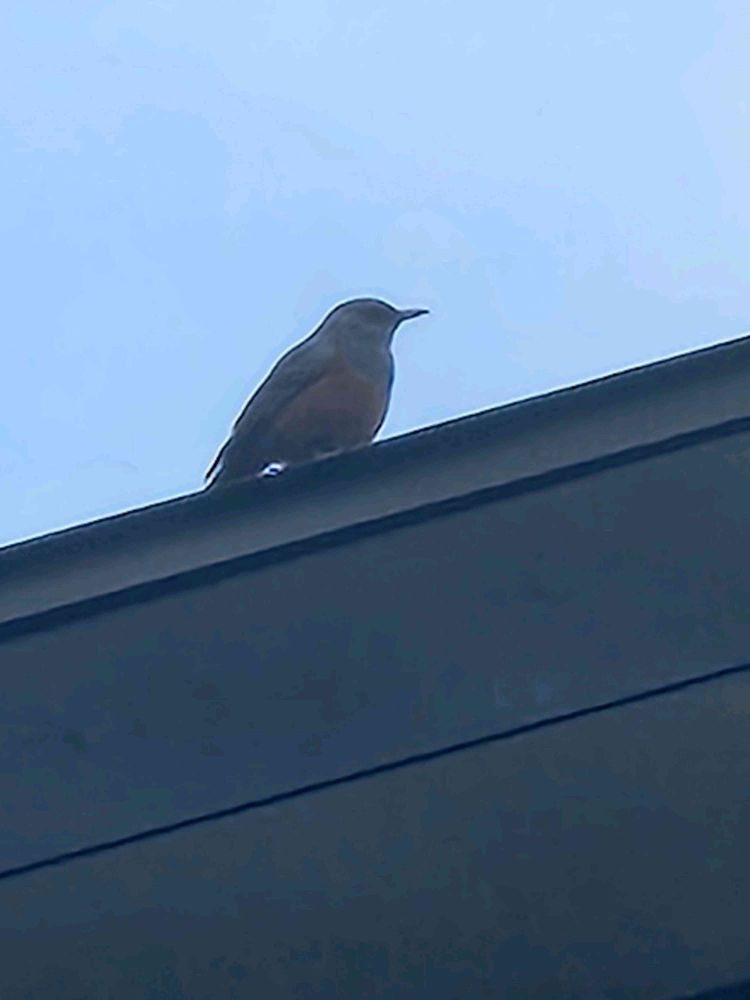 背中が青くて、お腹が赤茶色の綺麗な小鳥が、職場の裏庭の湧水付近にいましたが、カメラを向けたら、飛んで屋根の上に。