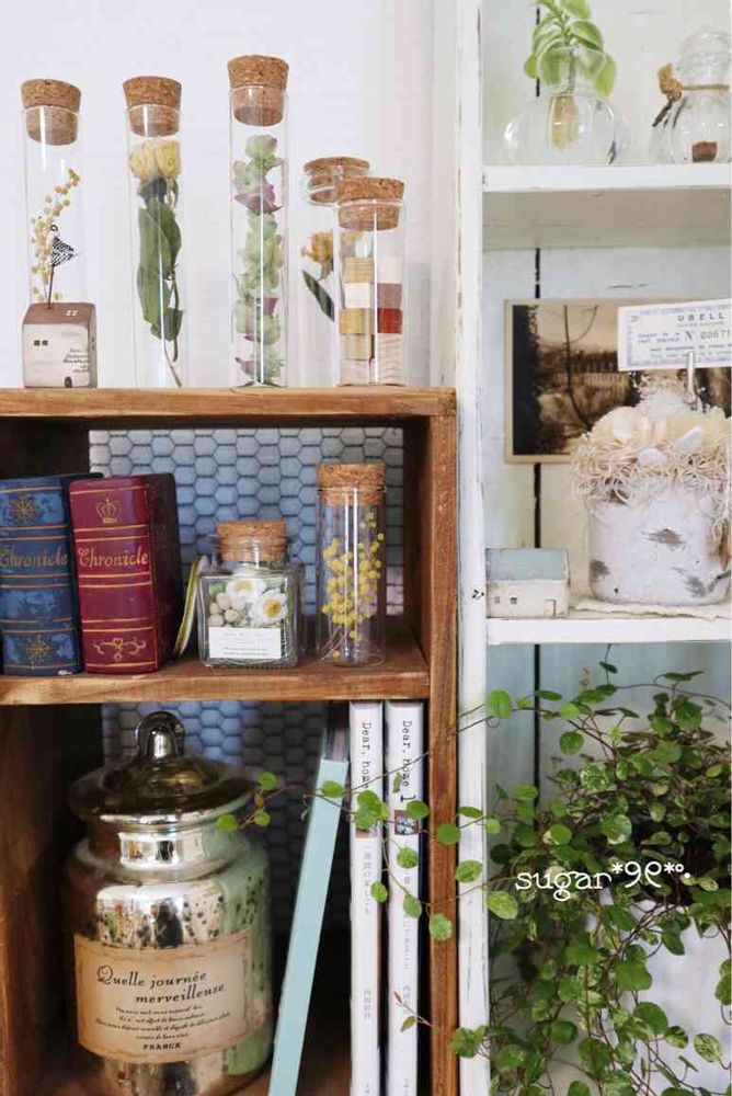 コルクの瓶にドライフラワー入れるの、いいアイデアですね♡💡