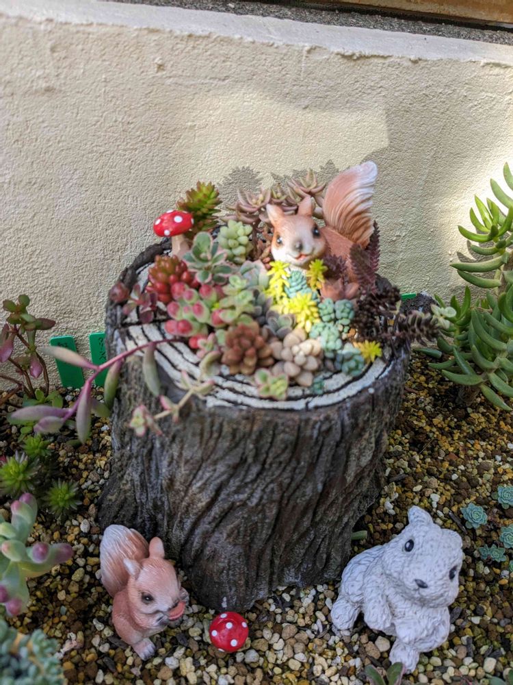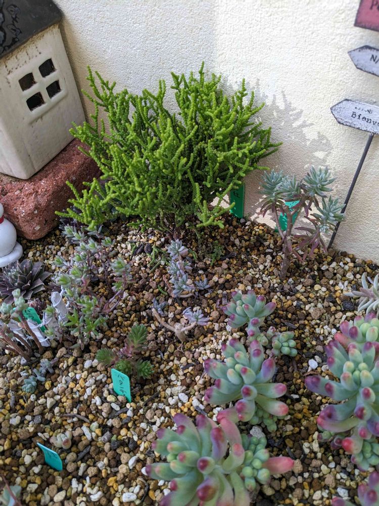 地植え花壇には可愛い小物と多肉ちゃん達が…。