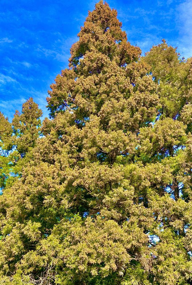 お山の杉たちは、茶色に色付いたたわわに太った花粉嚢(雄しべの葯)をびっしりと付けて、枝先が重そうです🌲