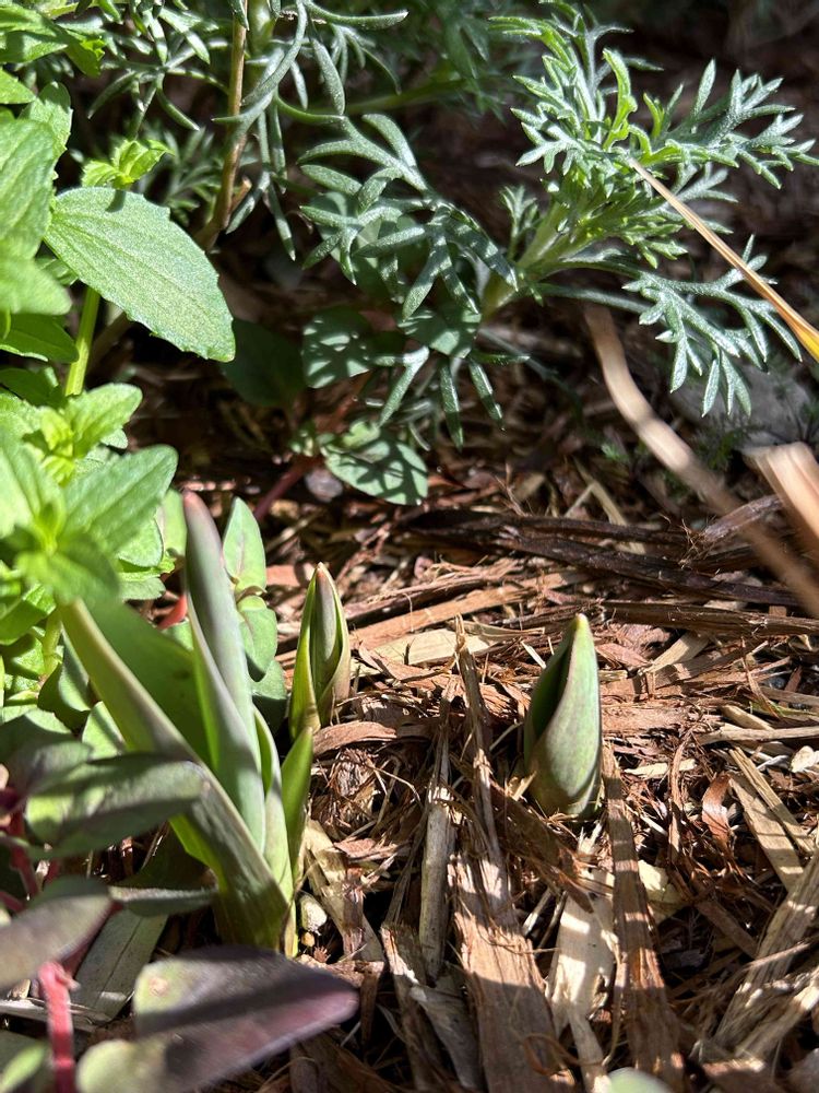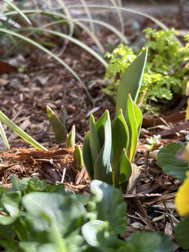 ウチもチューリップ🌷らしき葉もチョコチョコと出てきてます🌱