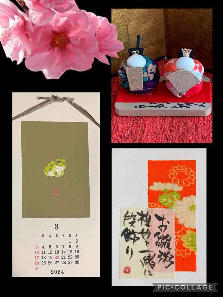 毎月、ステキなコラージュ楽しみに見させて頂いています。ハナモノの華やかさ、🎎の可愛さ、トリッキーな🐸、和のテイストのモスリン、字は力強いけど温かな俳句