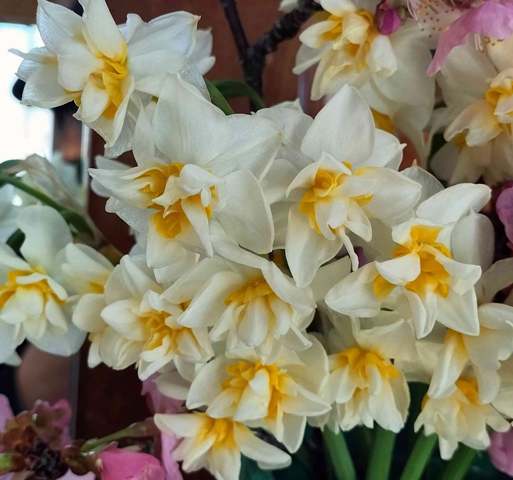 この水仙かわいいですよね😍先日私もお友達にいただきました🩷八重で唇のような黄色がかわいい😍