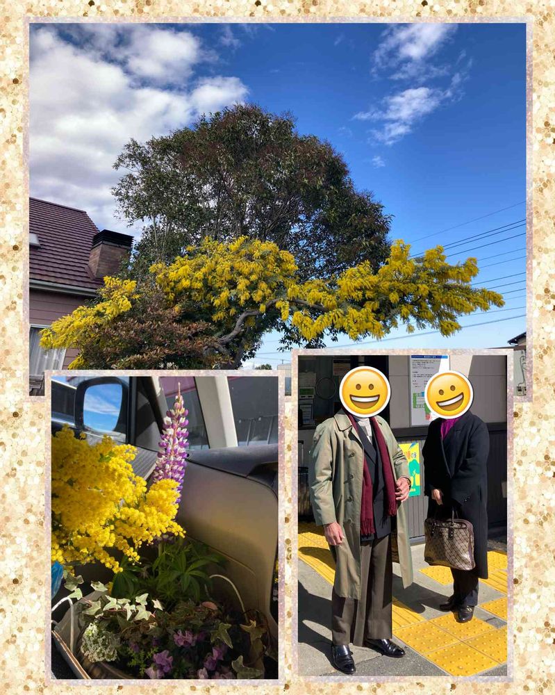 2️⃣今日は2月に会いに行けなかった両親に会いに実家へ、寄せ植えとミモザとお昼ご飯を持って🚙💨