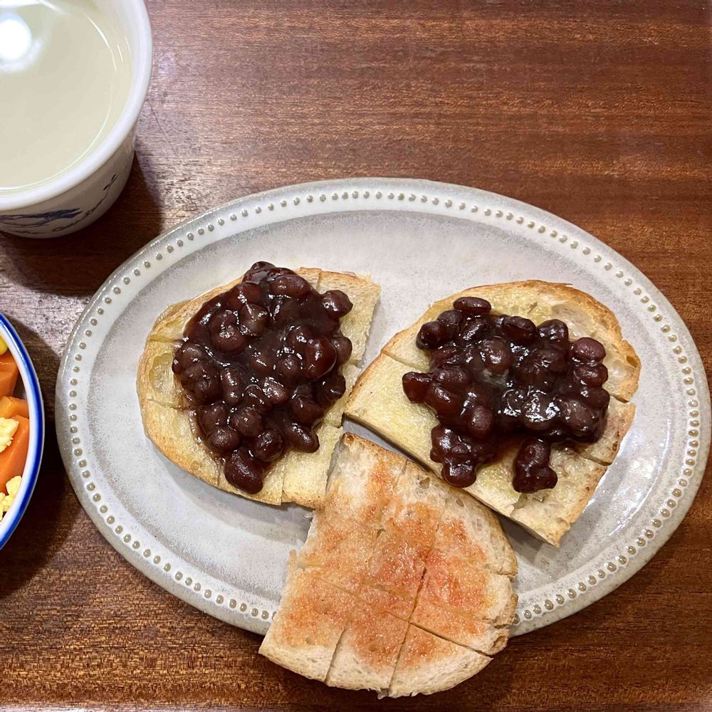 ‥切れ目を入れて焼いたトーストに、あんことバターを載せてもう一度トースターへ。そこで、ふとコレステロールが気になり、急きょ、マーガリン少し載せに変更。ごちそうさまでした😋💕🙏