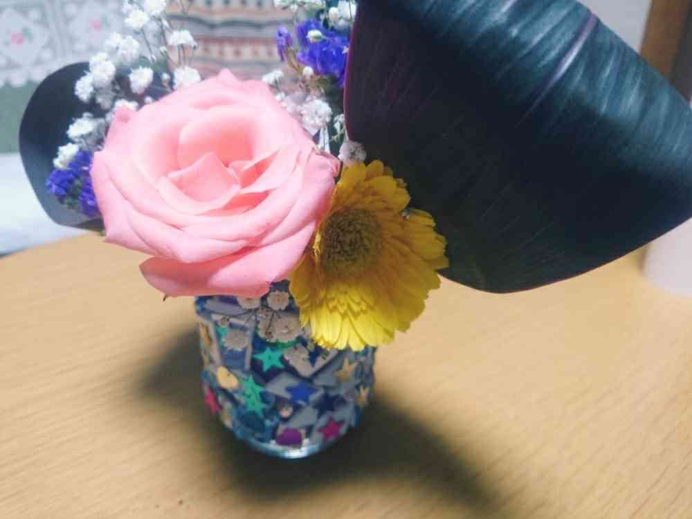 父がデイケアで参加したフラワーアレンジメント、台になる花瓶の装飾は前の週に製作したものです。