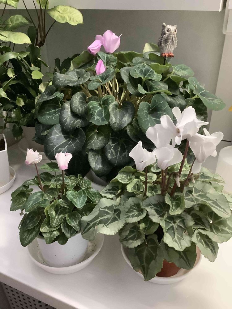 今シーズンのシクラメンたち勢ぞろい。大、中、小とそろえました。どれも1000円以下で、2ヶ月以上咲いています。お得だなー。🉐
