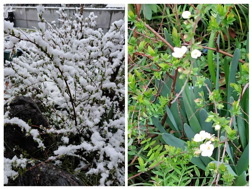 ユキヤナギに雪☃️寒そうですが風情がありきれいですね✨