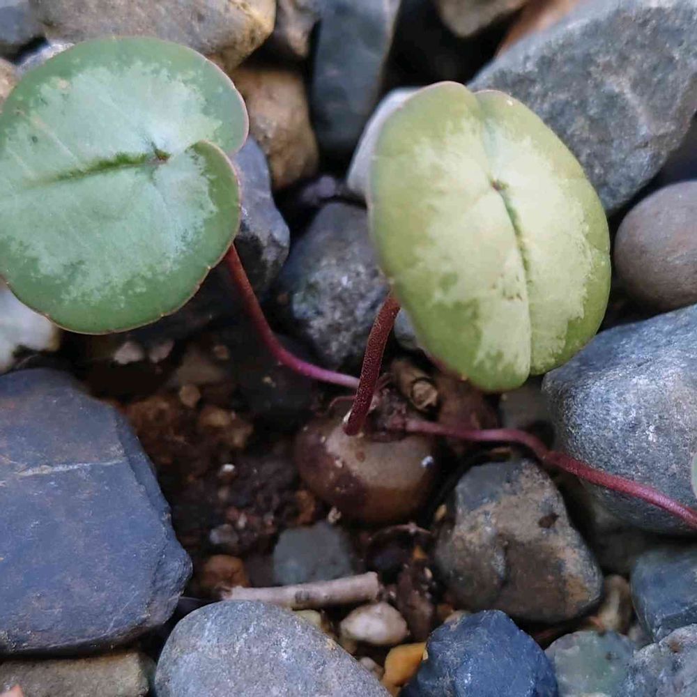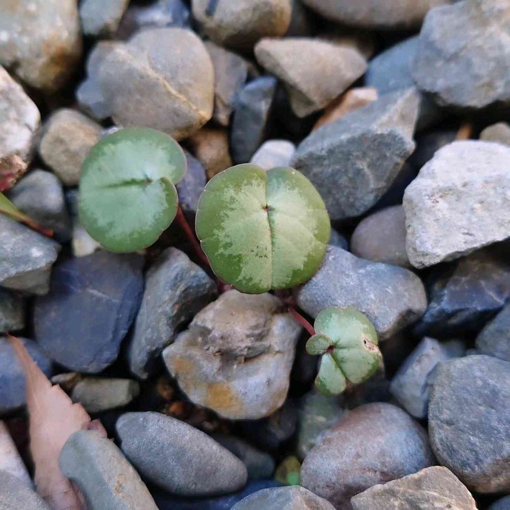 草むしりしてたら、砂利敷きからシクラメン コウムが葉っぱ出してた。鉢植えからのこぼれ種だろうけど、何故こんなところに?