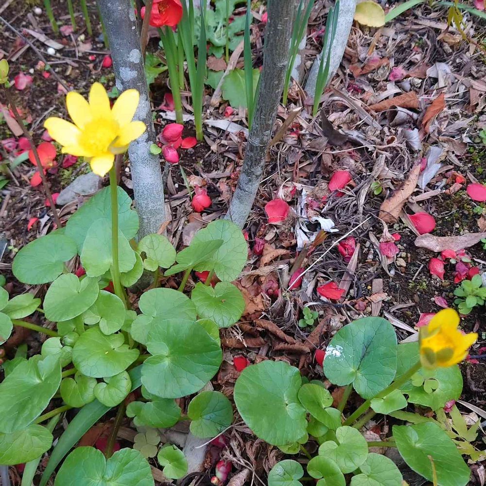 木瓜の下には出どころ不明のリュウキンカ。ツヤツヤな花弁が綺麗。