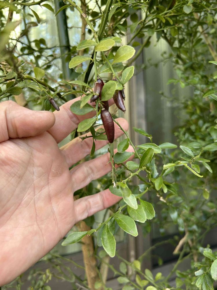今の家のフィンガーライムのバイロンサンライズになります。昨年秋に開花した花が結果してます。寒さに当たってあまり期待できませんが、試験栽培としてひとつ収穫できるまで残してみます。