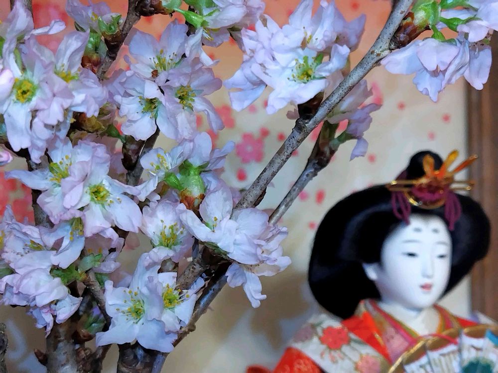 結局先週の法事で飾った啓翁桜が満開なのでそれを雛人形の横に飾りました🌸
