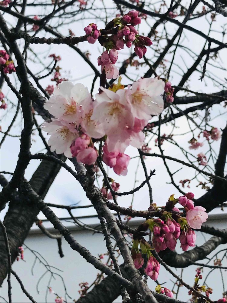 買い物の通り道に、早咲きの桜🌸が咲きはじめていました♪☺️