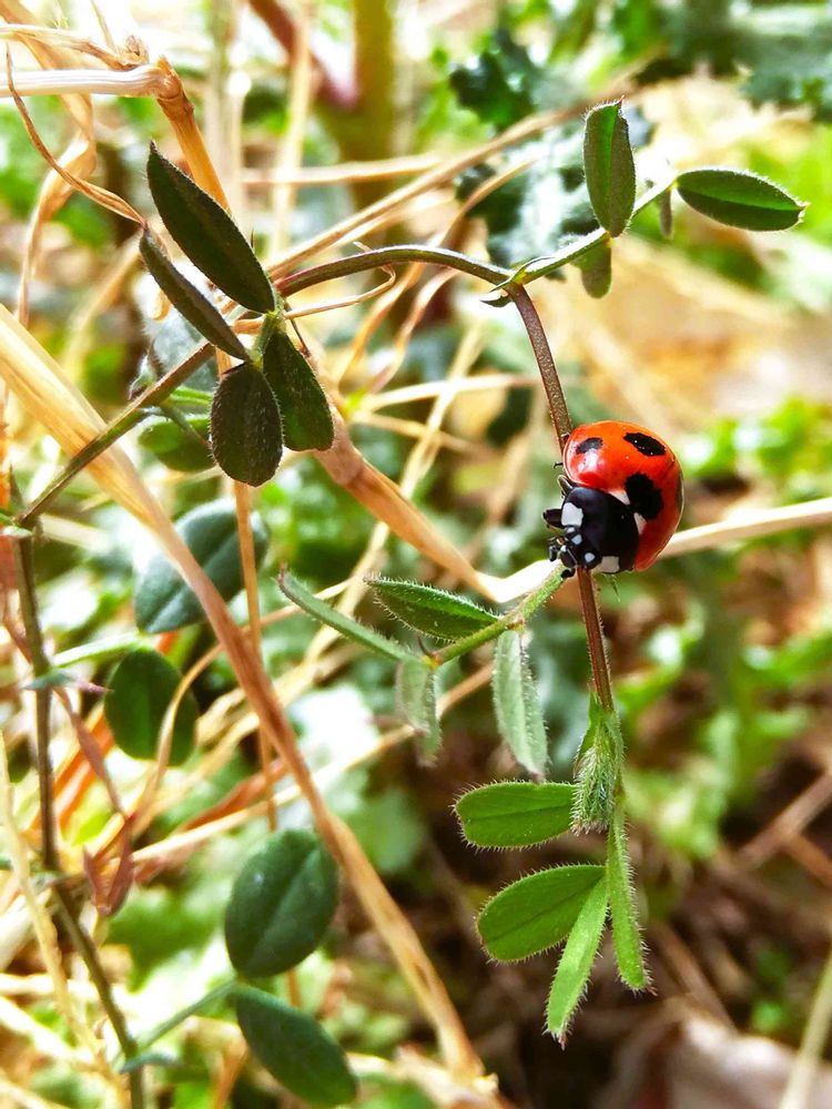 カラスノエンドウの枝を歩いていたナナホシテントウ