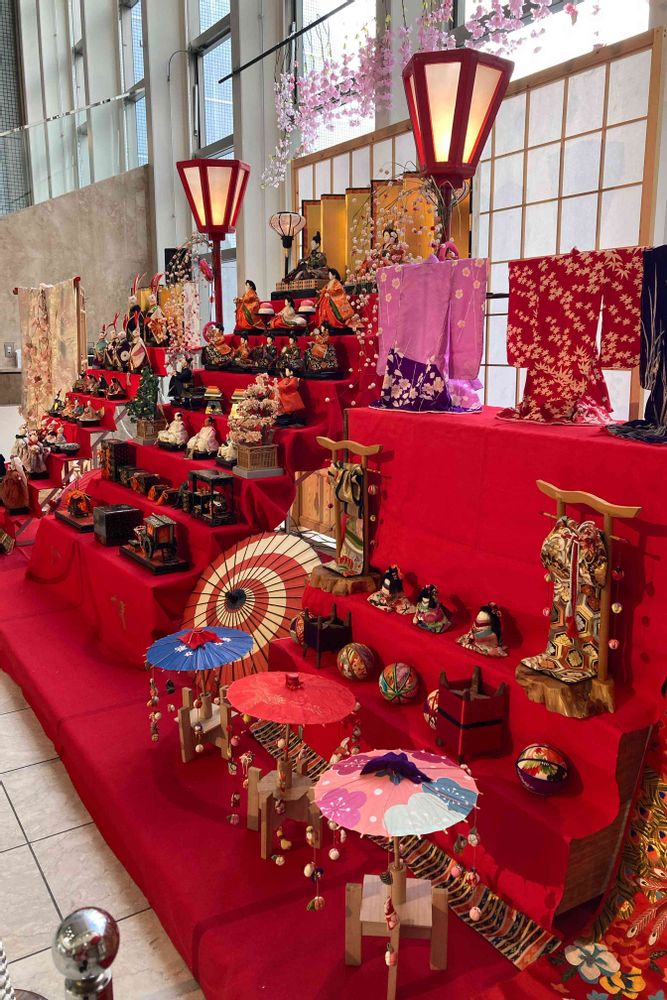 我が市の文化会館(ルミエールホール)にサークル・布クラフトさんの古布で作った雛人形が展示してあります🍀*゜