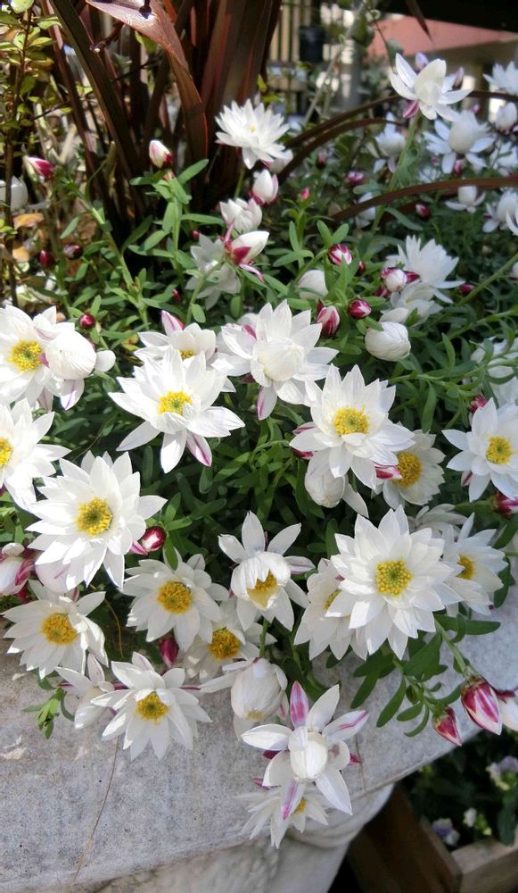 この花は ハナカンザシの仲間で ペーパーカスケードと言う品種です。花の先端が尖っているので 見分けられます。
