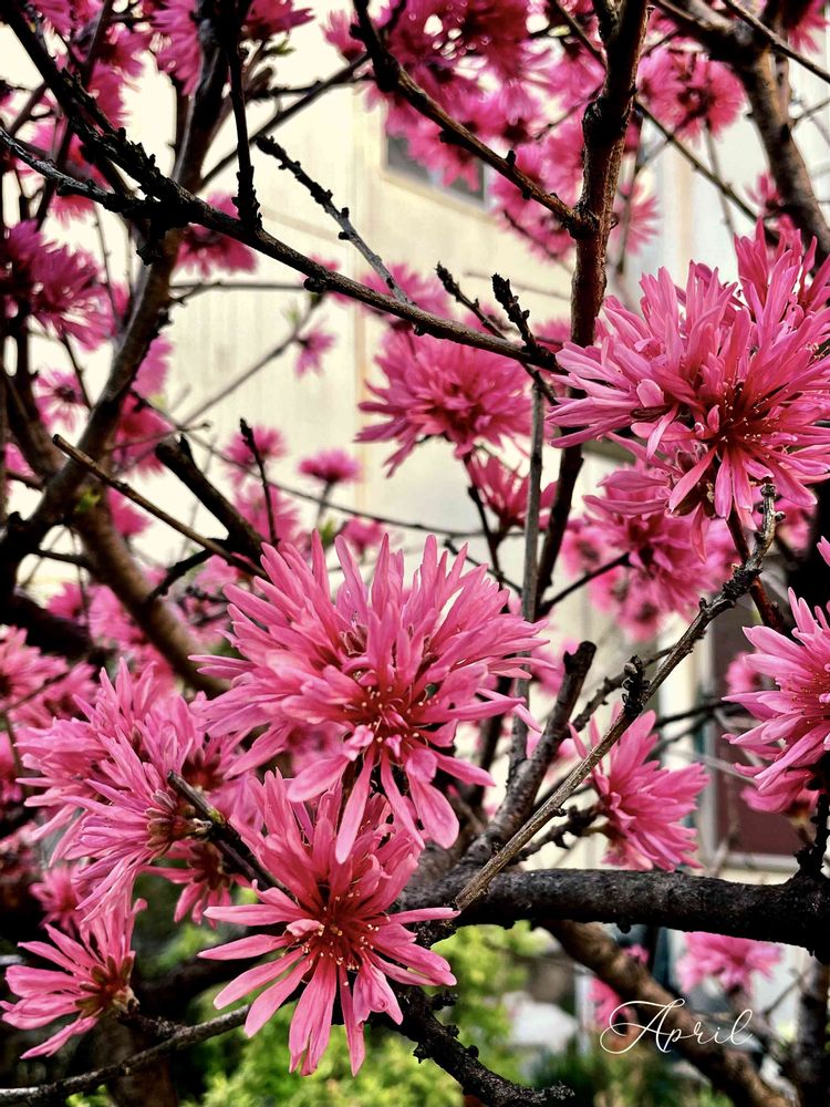 今日のお花、モモの品種にある花桃、その中にも数種類があります💖鮮やかなピンクのキクモモ、個性的で美しくて好きなんです😍💕