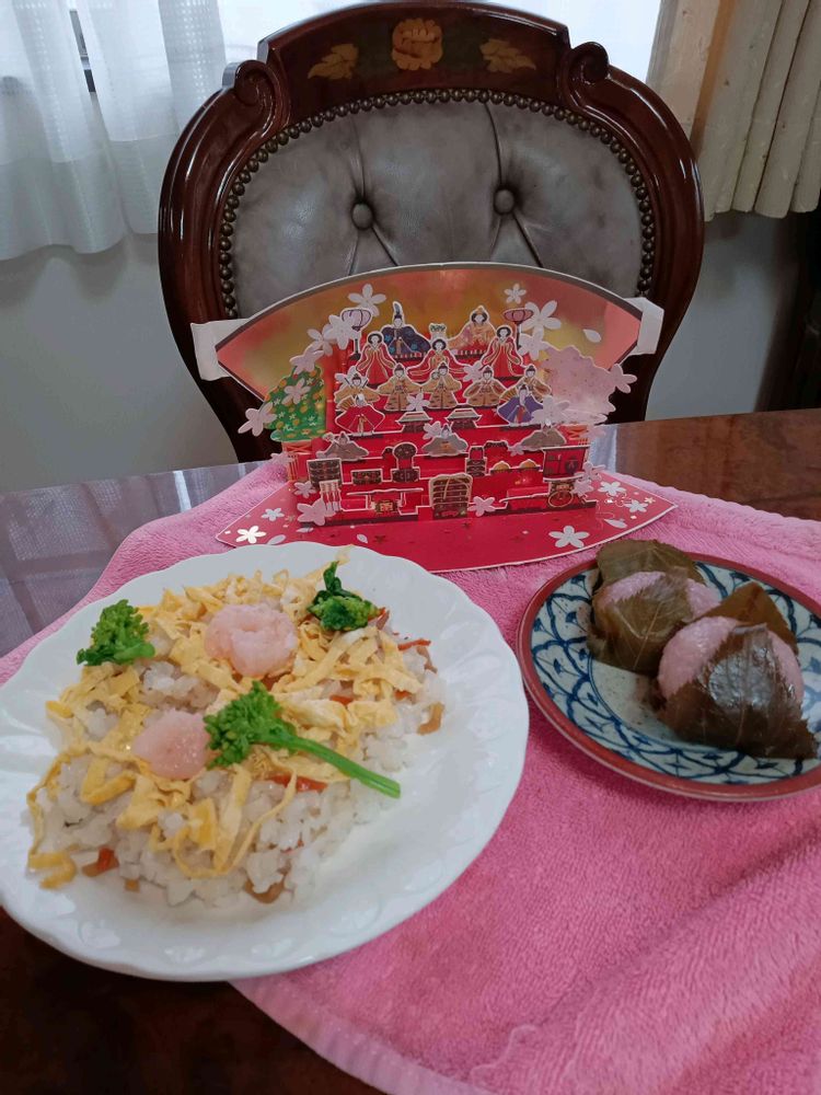 我が家は、カードのお雛様ですが、ばら寿司を作りました、桜餅も添えて〜手作りのお雛様は、行きつけのお店にて~素敵なひな祭りをお過ごし下さい✨🌸🎎