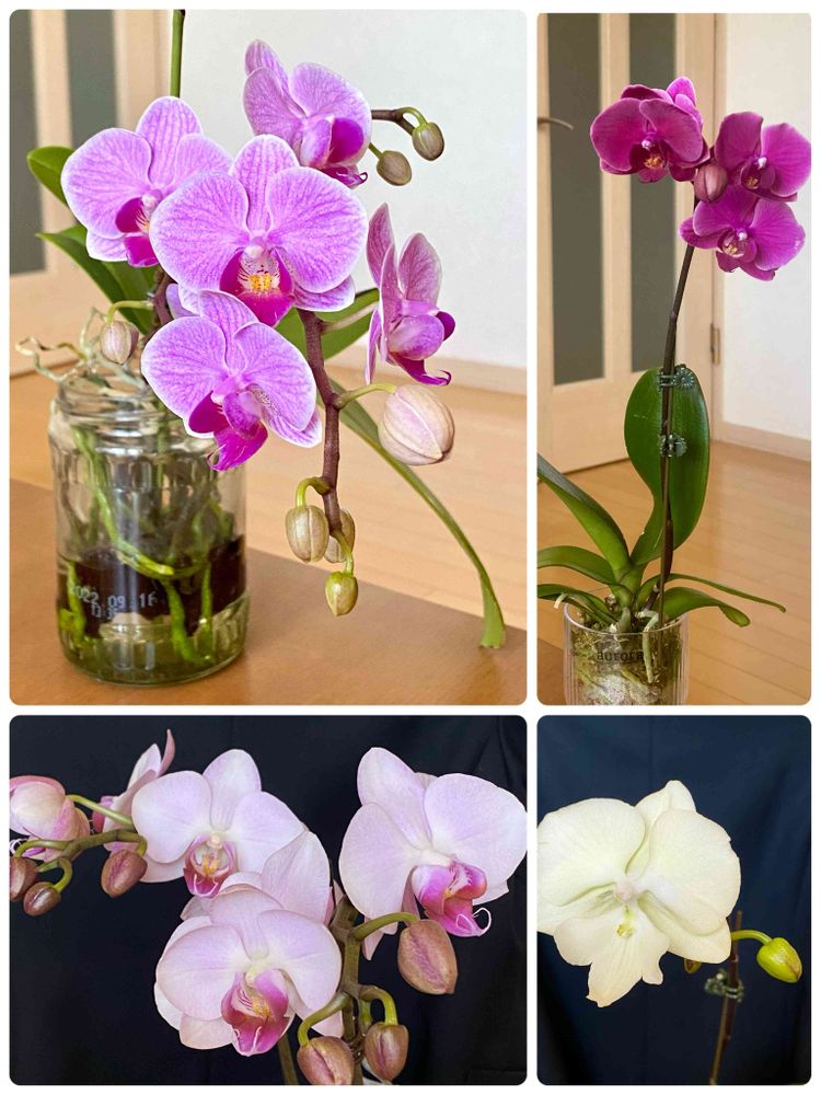 水栽培はね、瓶🫙とかに植え込み材なしで胡蝶蘭入れて、瓶の下の方に根っこ何本かが浸かるくらいに水入れて1、2日したらお水捨てて3、4日乾かす感じなの